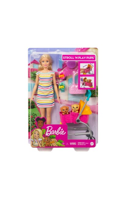 Barbie ve Köpekleri Geziyor Oyun Seti ile hayvansever kızlar, köpeklerini gezdirirken Barbie'ye yardım edebilir. Oyun setinin içinde dönüştürülebilir özellikli puset, iki yavru köpek ve köpeklerin bakımı için yedi aksesuar var!