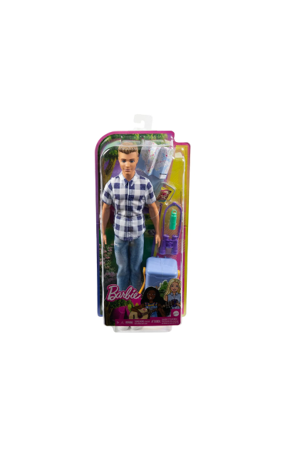 Ken, önü düğmeli ekose desenli gömleği, eskitilmiş kot pantolonu ve günlük tarzdaki beyaz spor ayakkabılarıyla klasik kamp kıyafetini giyer.